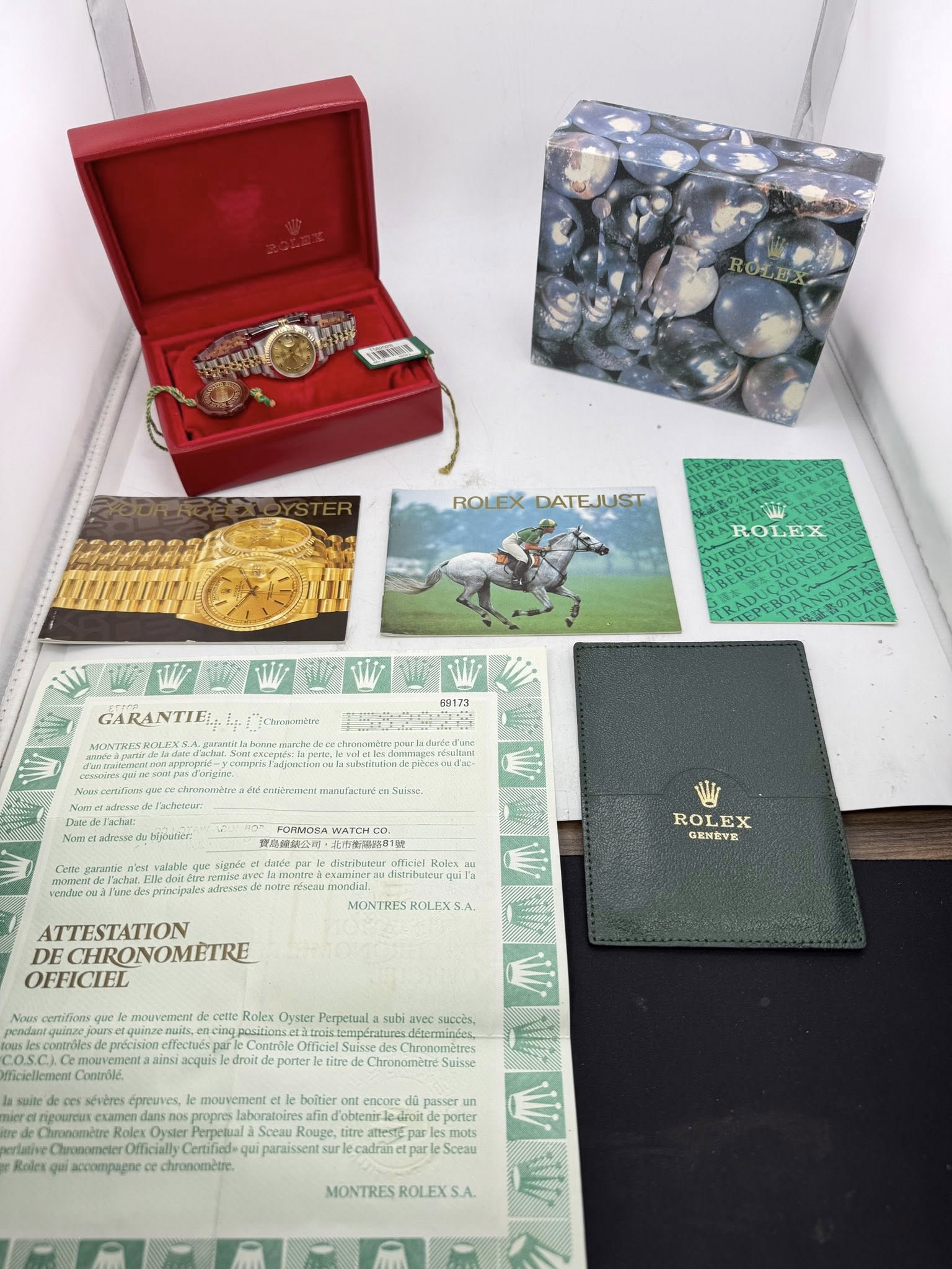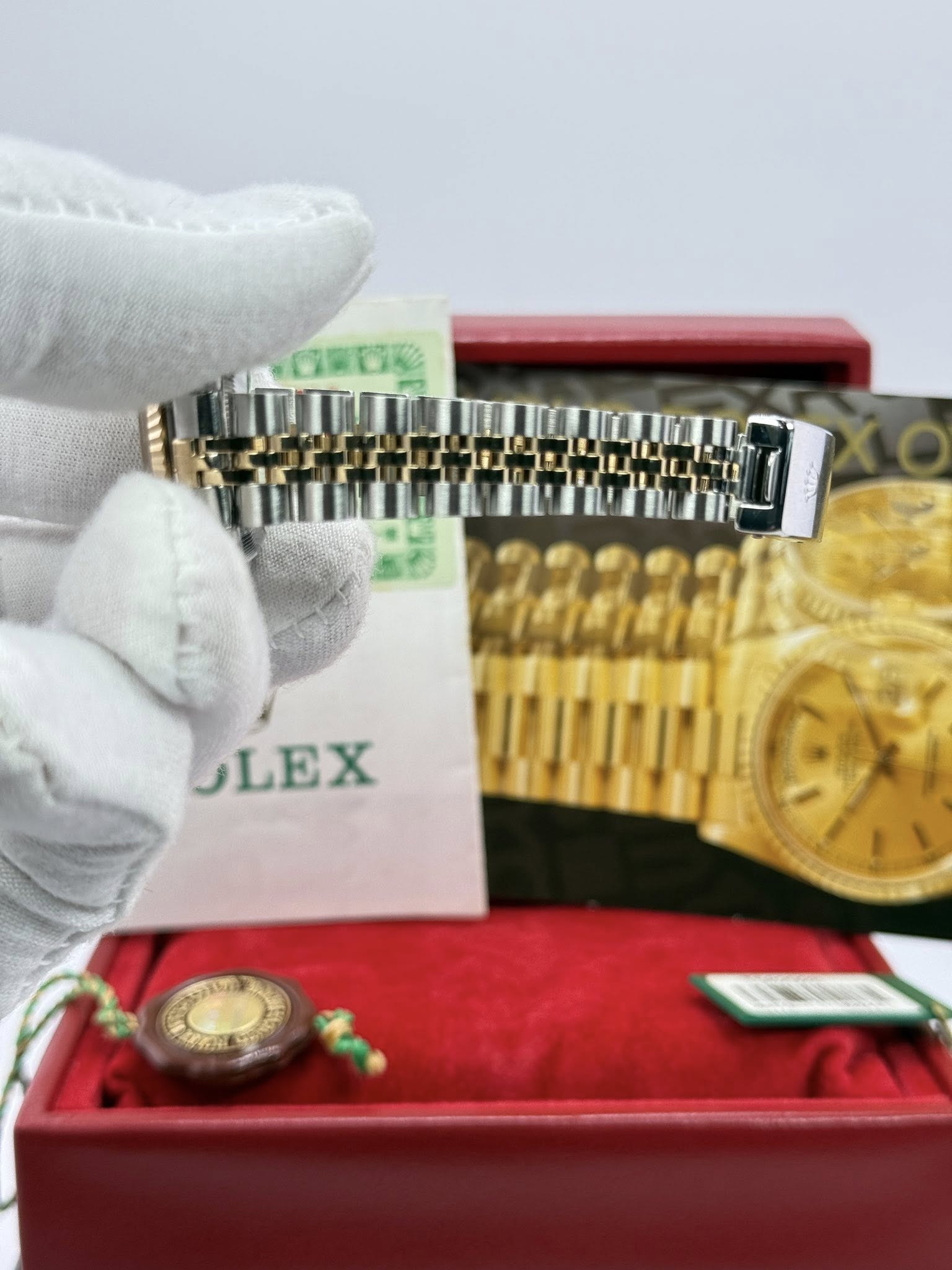 A beautiful ladies 26mm two tone datejust. NOS New Old Stock It features an 18k jubilee bracelet, solid 18k gold fluted bezel and a stunning champagne roman dial. Brand new condition still has case back sticker zero bracelet stretch unworn unsized