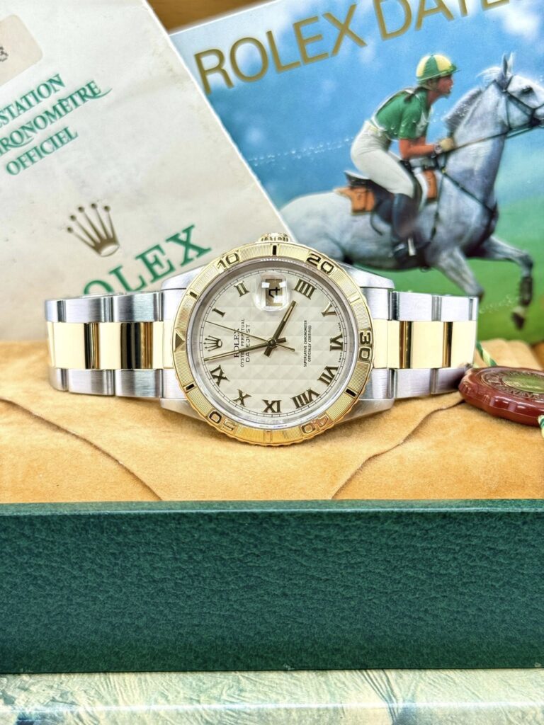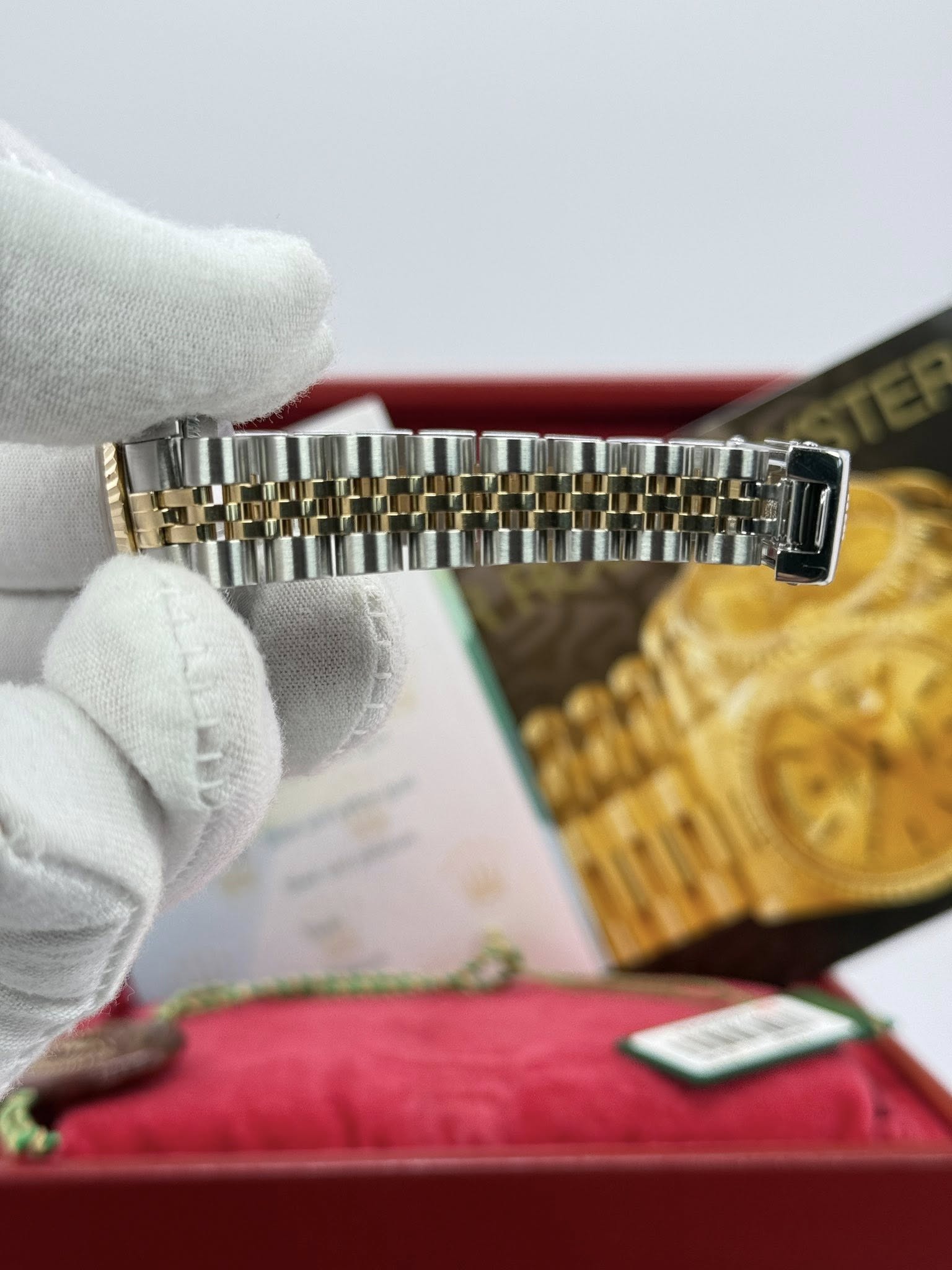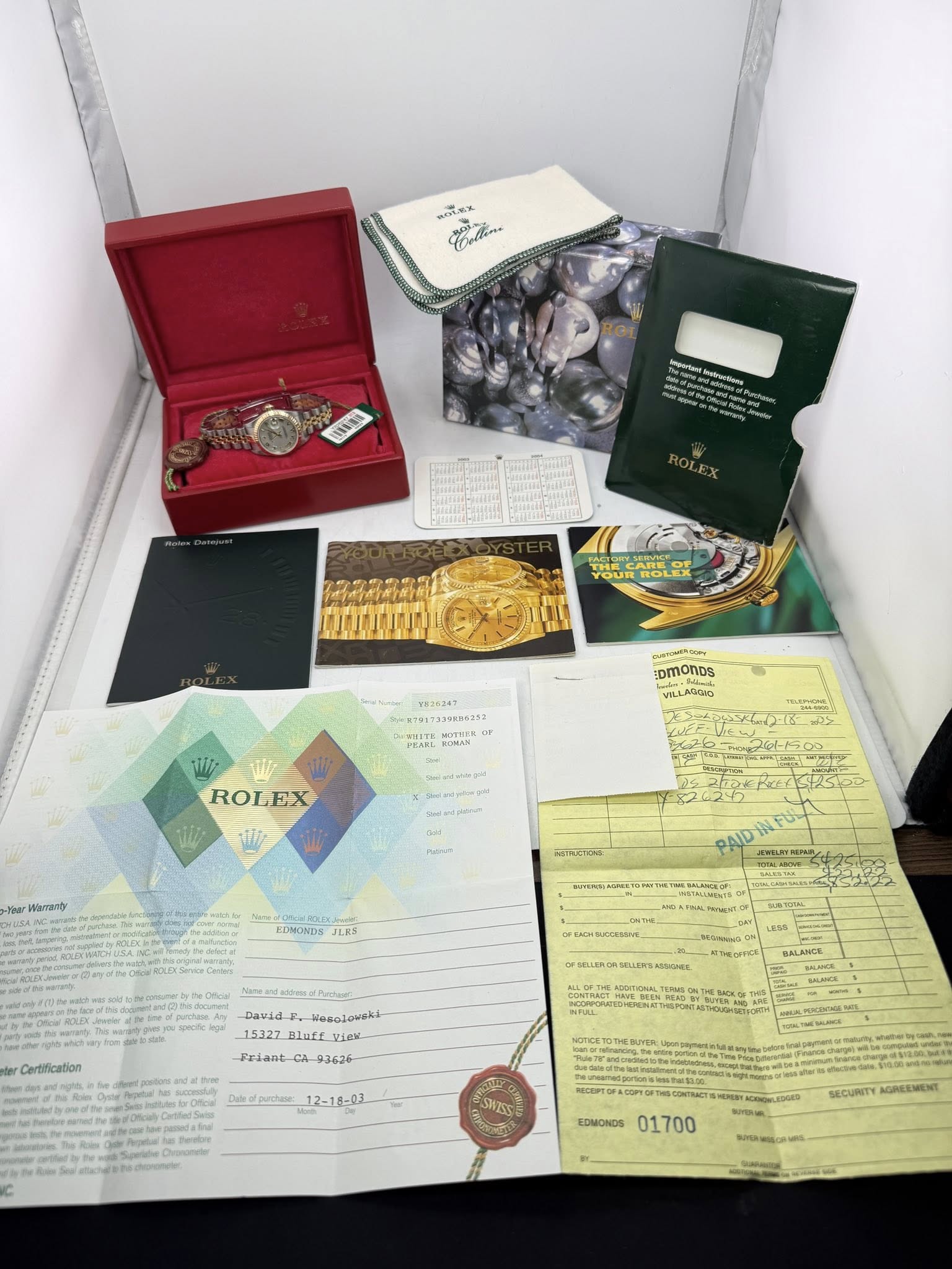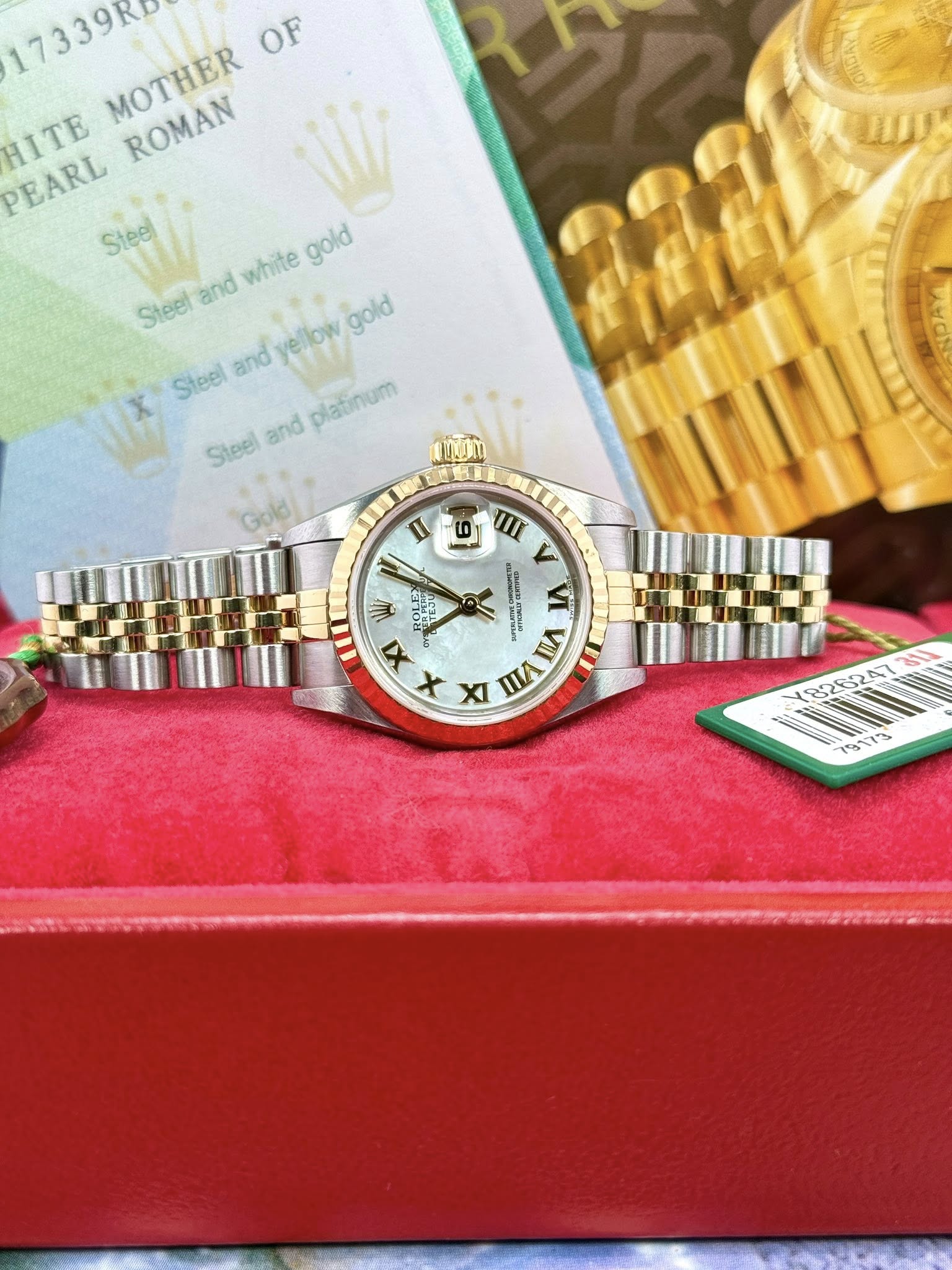 A exceptionally beautiful and rare ladies 26mm Date-just. It features a solid 18k gold fluted bezel, Two tone 18k gold jubilee bracelet and a very rare Mother of Pearl Roman dial. Complete set even has original purchase receipt