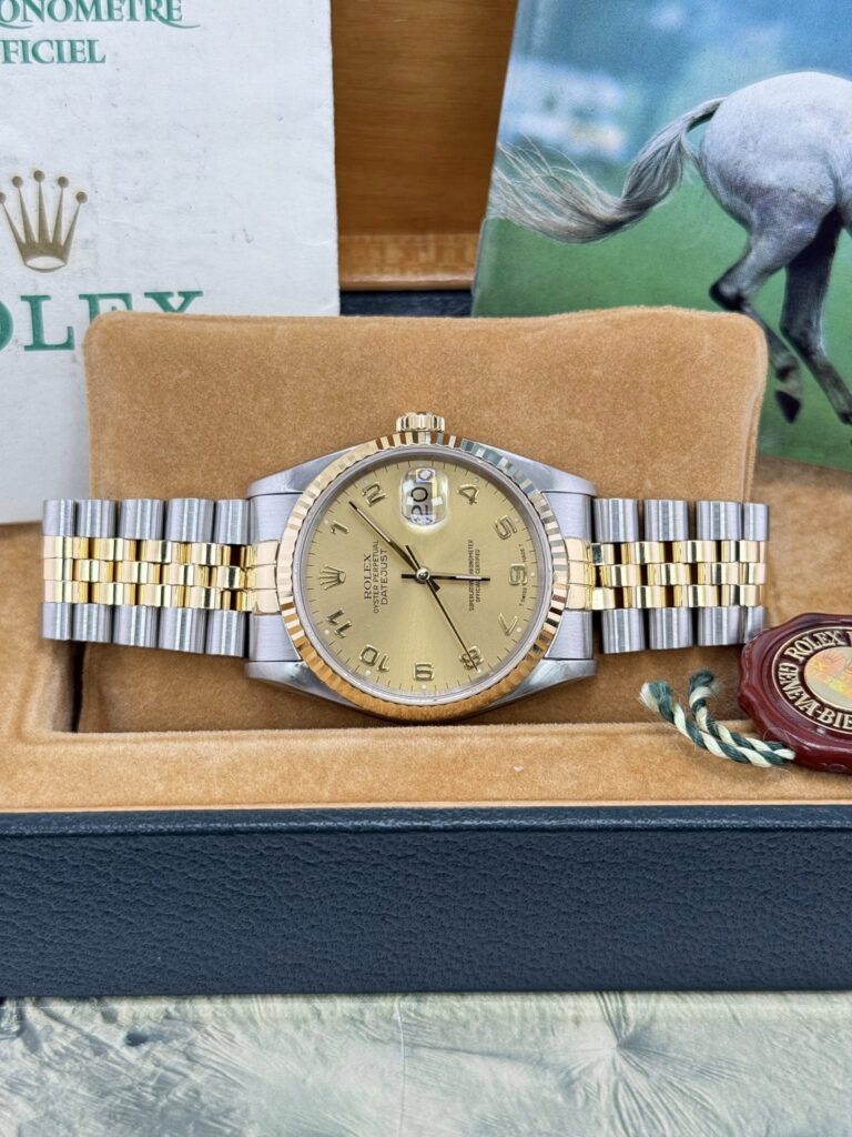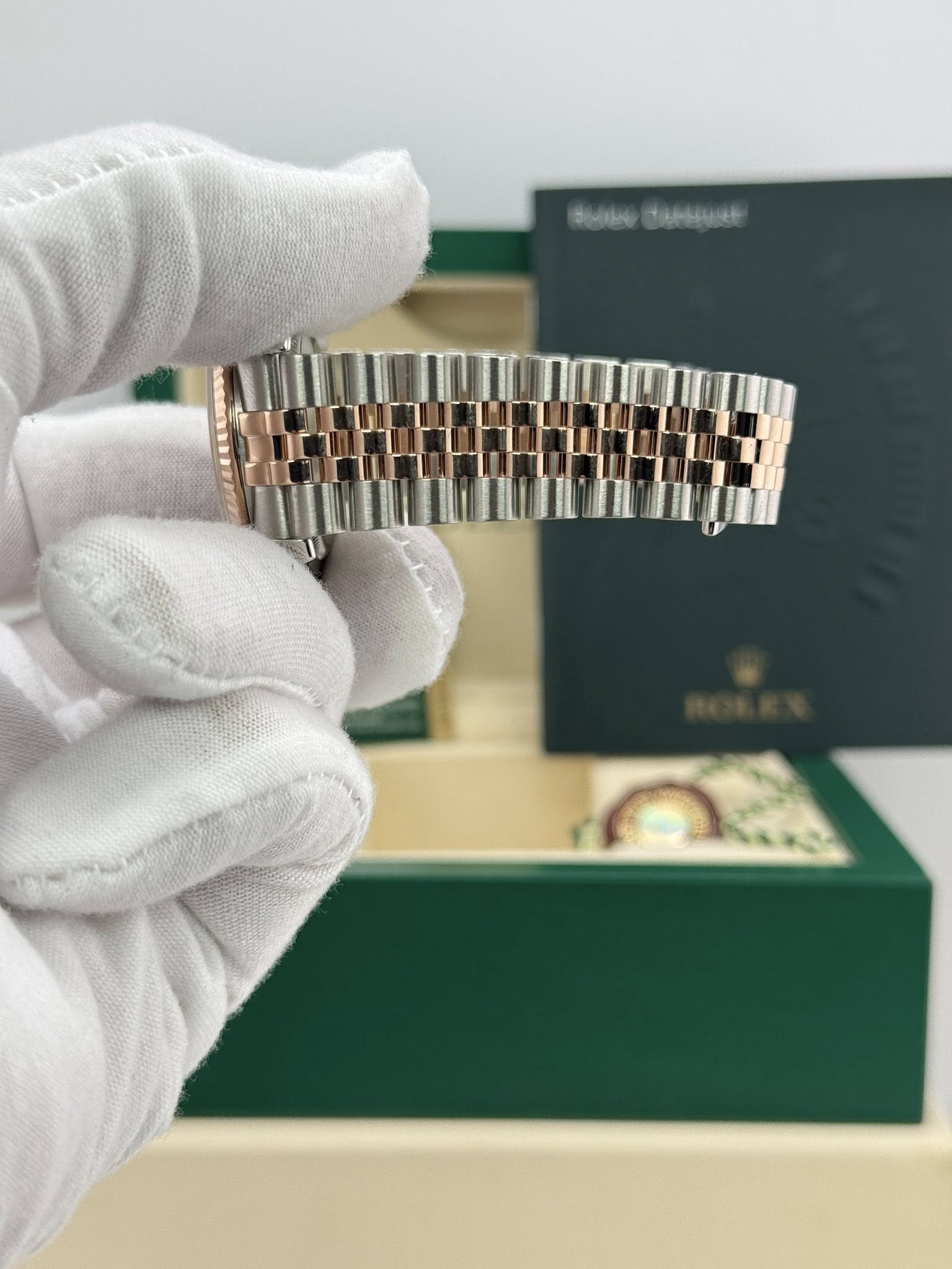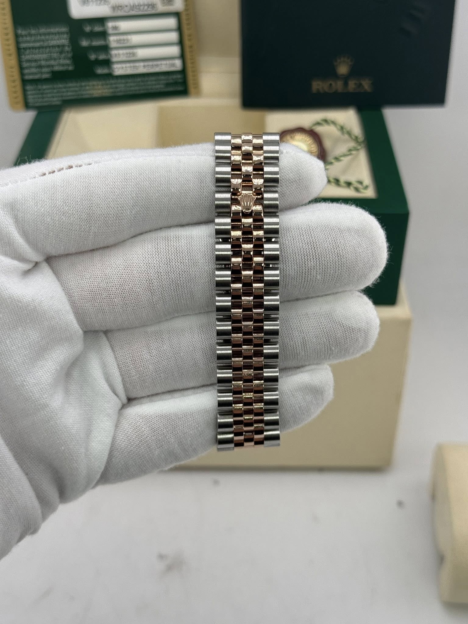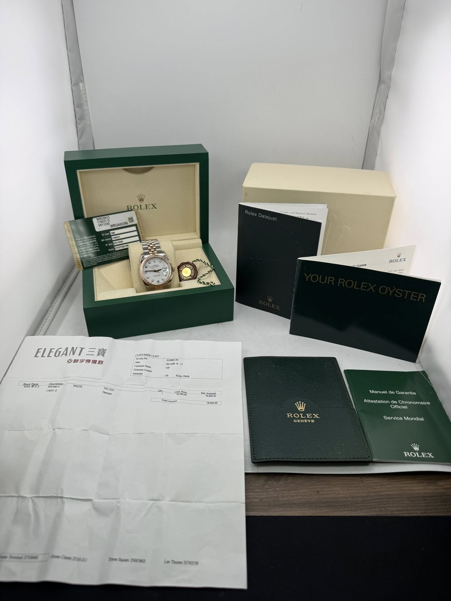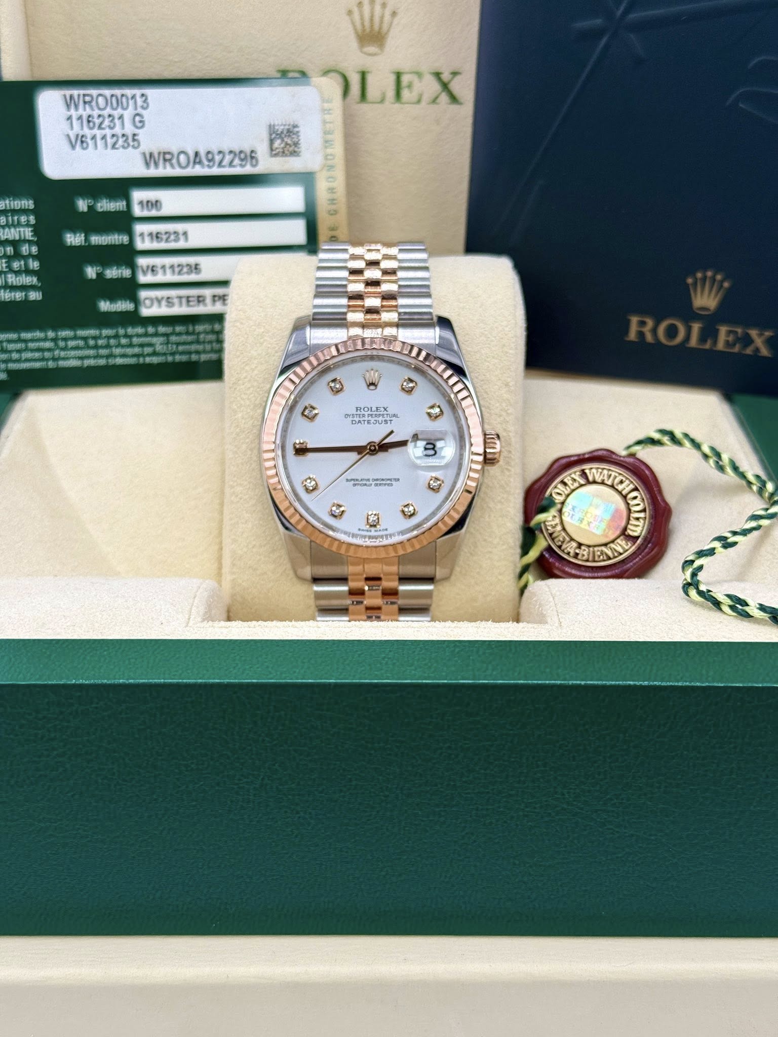 A beautiful 36mm 18k Everose gold two tone Datejust. It features a solid 18k gold fluted bezel, two tone 18k gold jubilee bracelet with hidden clasp and a stunning white diamond dial. In amazing condition with a tight bracelet. Recently cleaned and pressure tested its running great.