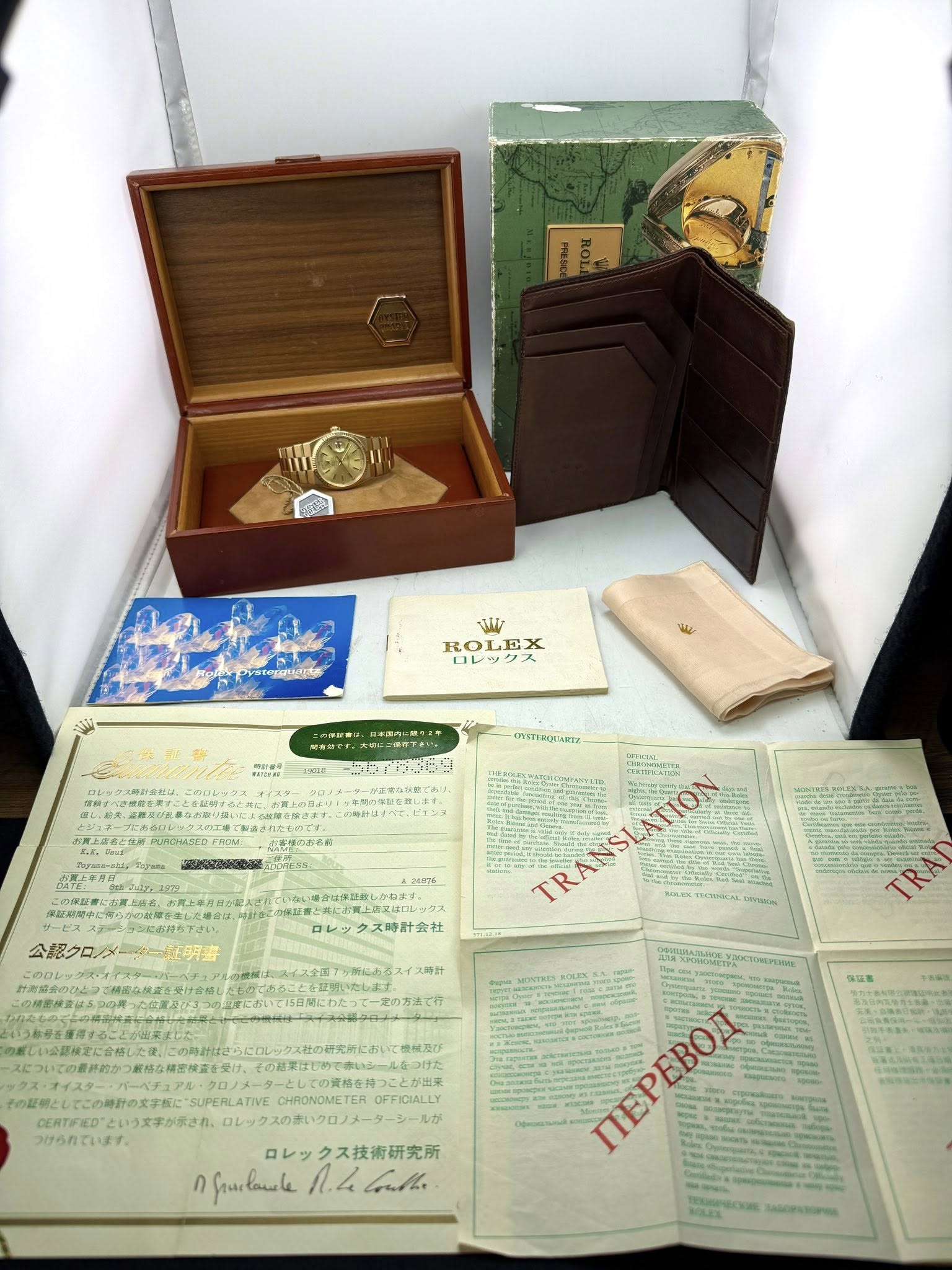 An absolutely stunning 36mm Oysterquartz Rolex day date President. The flagship in the line it features a solid 18k gold case, bezel, bracelet, crown, clasp and a beautiful champagne stick dial. Some wear here and there but overall amazing condition especially for the age. Crazy rare to find this complete
