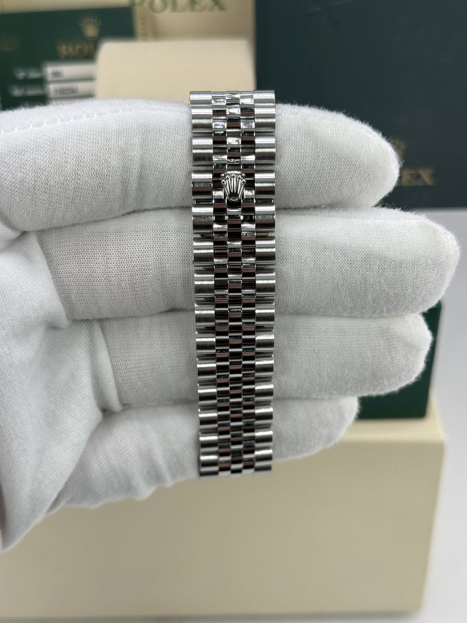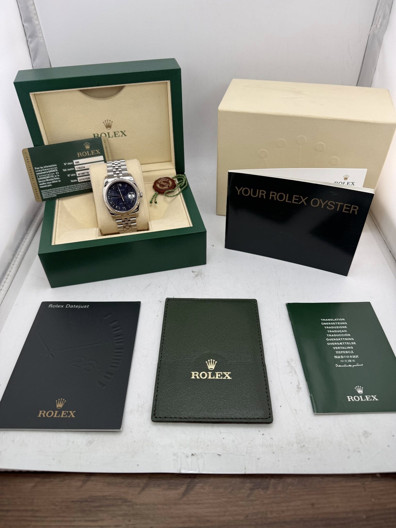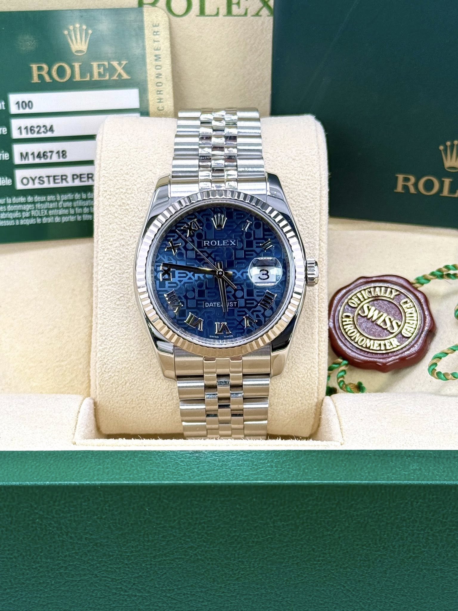 A stunning 36mm 18k white gold and steel Date-just. It features a solid 18k gold fluted bezel, steel jubilee bracelet and a beautiful blue anniversary dial. A newer reference model with hidden clasp jubilee. An amazing timepiece with a tight bracelet.
