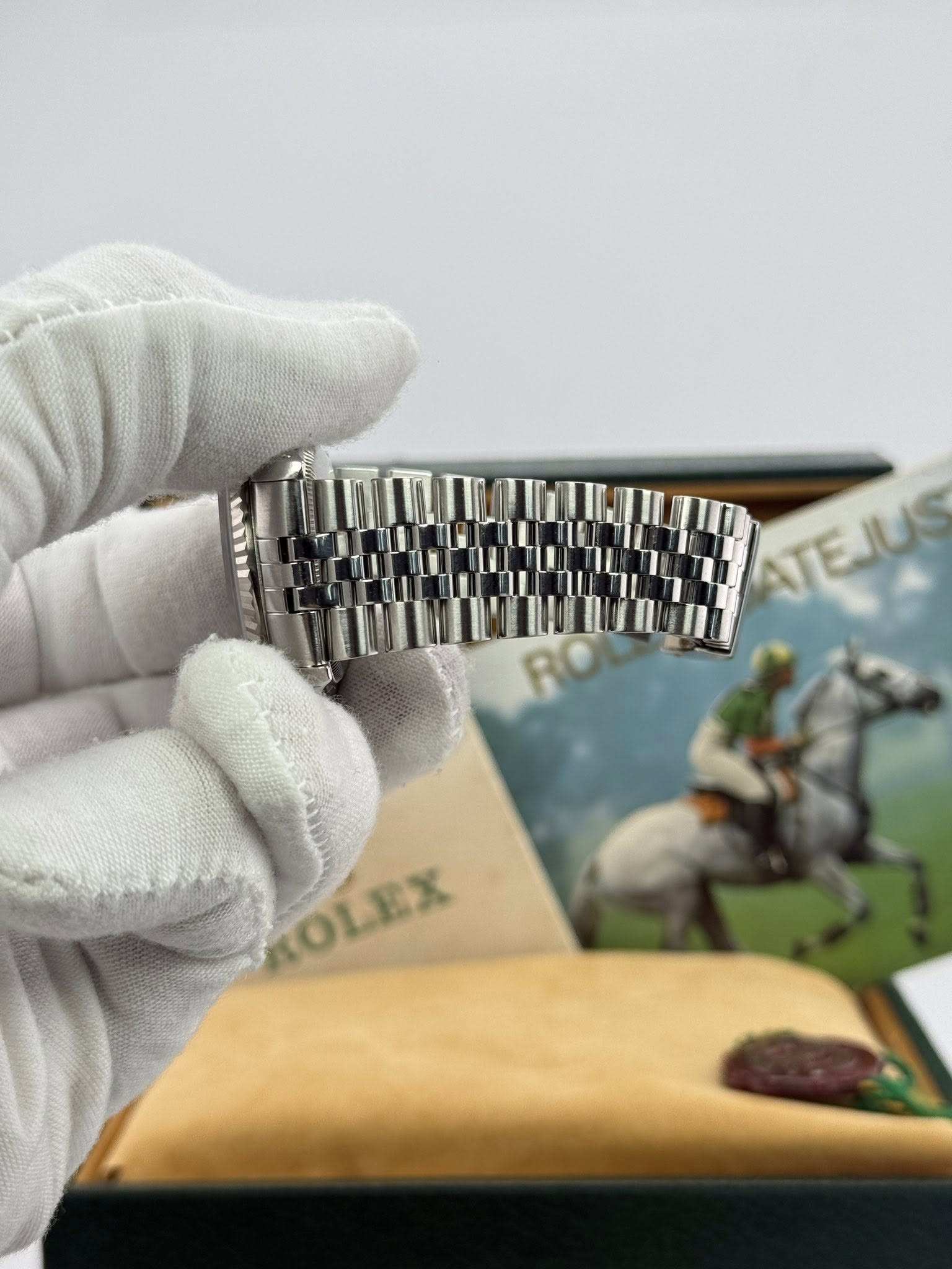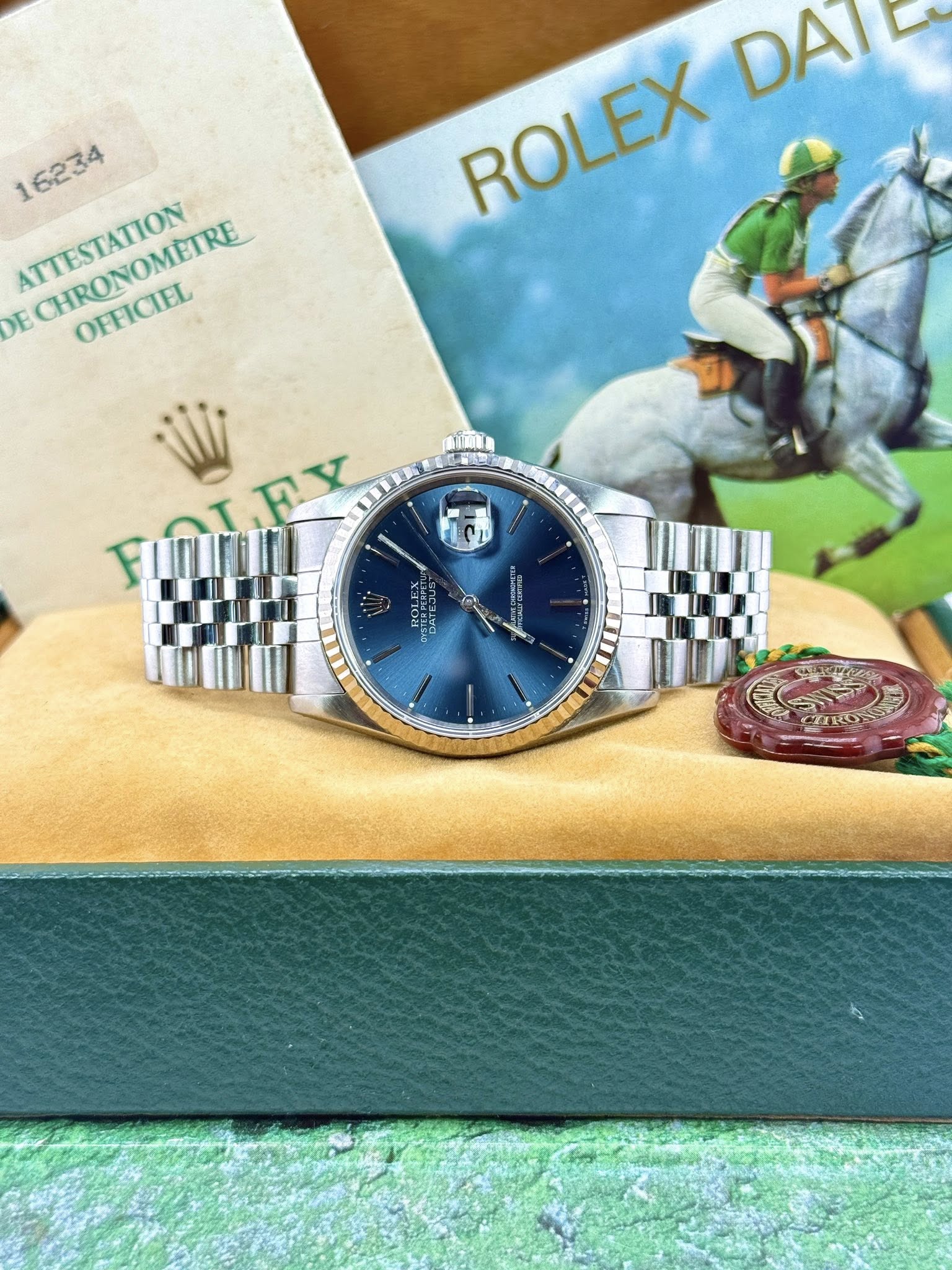 36mm 18k White gold and steel Date-just with a steel jubilee bracelet, solid 18k gold fluted bezel and rare blue baton dial. A beautiful piece in great condition.