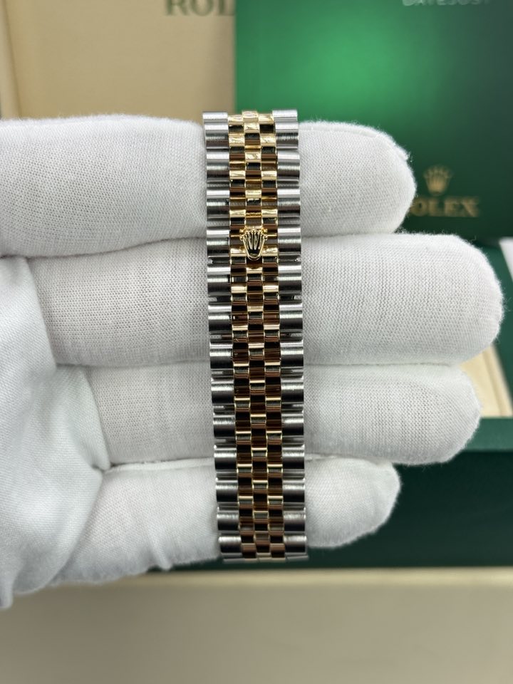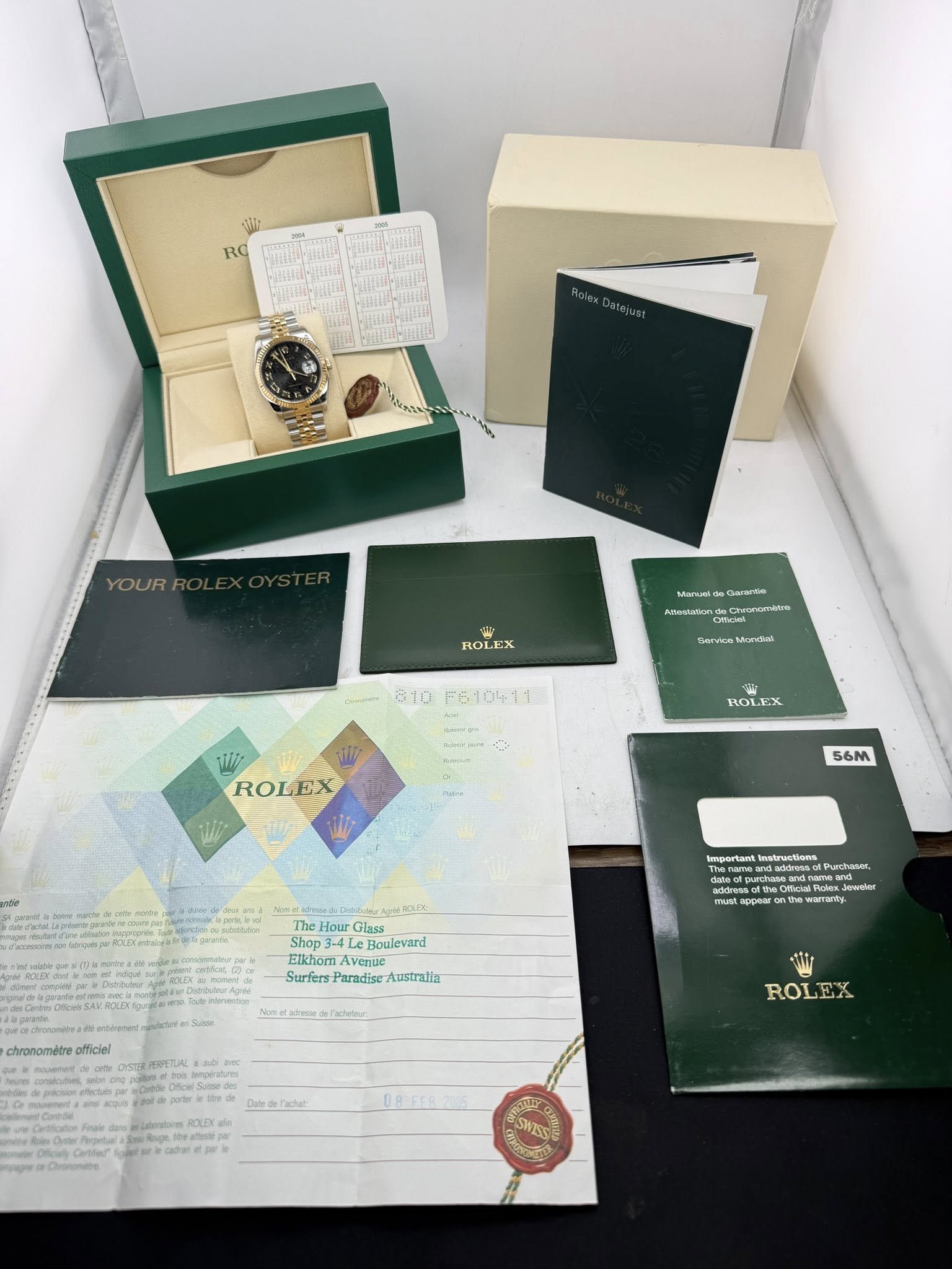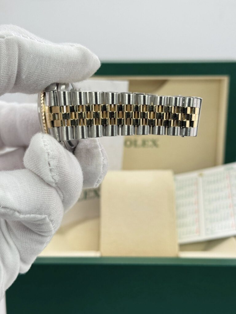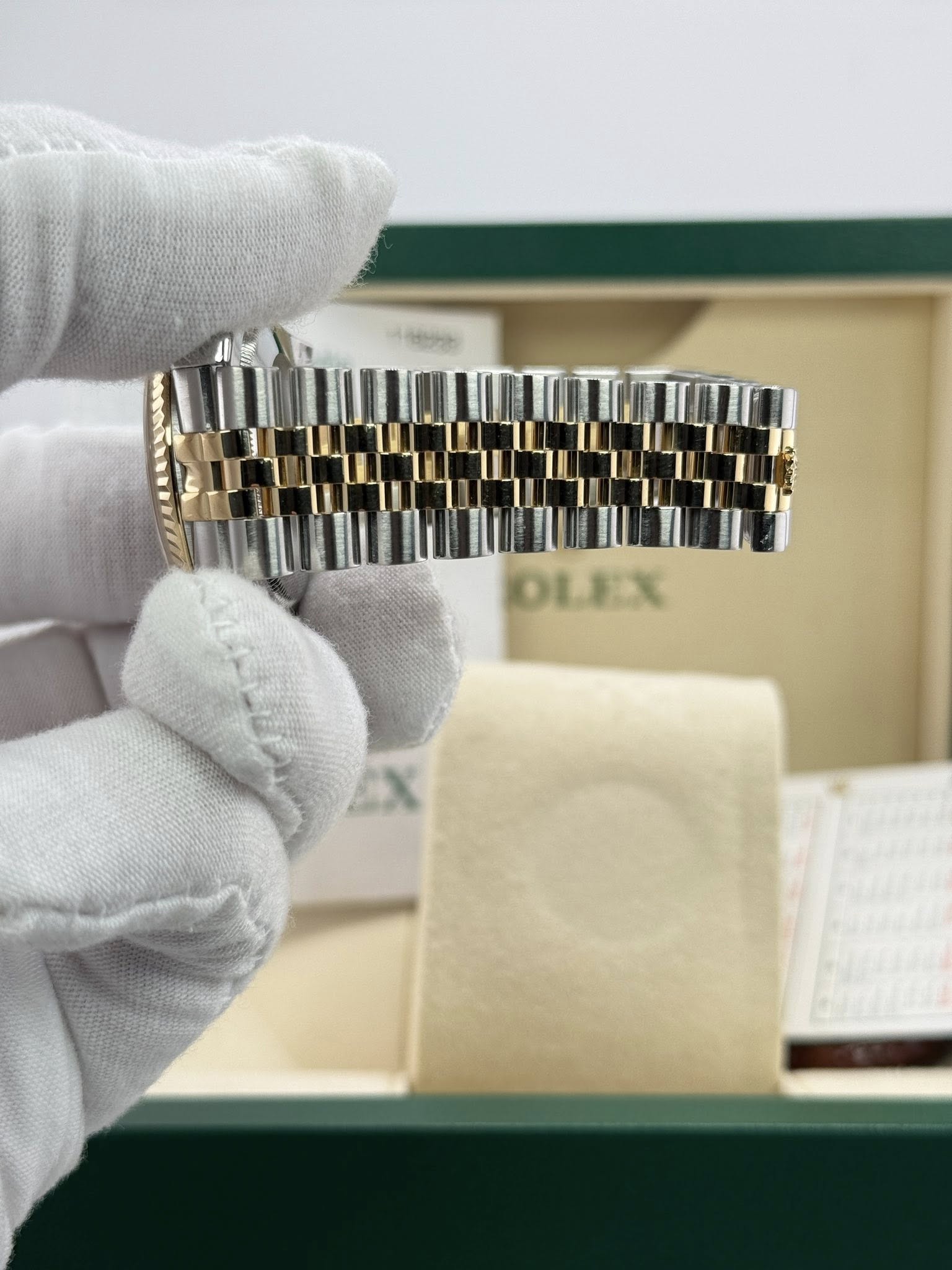 A stunning 36mm Two Tone Datejust. It features a solid 18k gold fluted bezel, Two Tone 18k gold jubilee bracelet with hidden clasp and a stunning black anniversary dial with gold roman numerals. It’s a 116233 vs a 16233 so it has the larger case, solid gold center links and the hidden clasp.