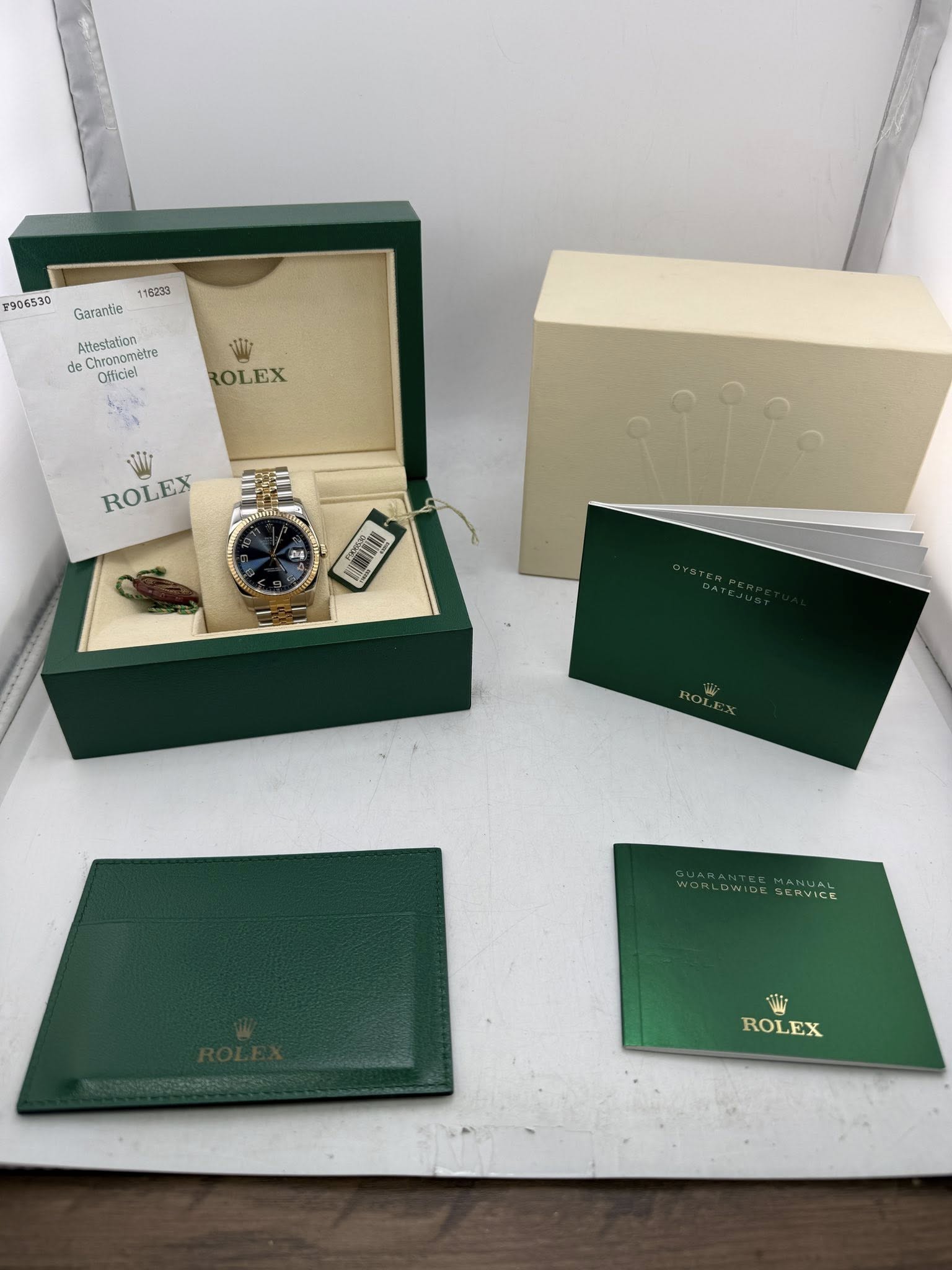 A stunning 36mm Two Tone Datejust. It features a solid 18k gold fluted bezel, Two Tone 18k gold jubilee bracelet with hidden clasp and a beautiful blue concentric dial. It’s a 116233 vs a 16233 so it has the larger case, solid gold center links and the hidden clasp. Recently cleaned polished and pressure tested its running great.