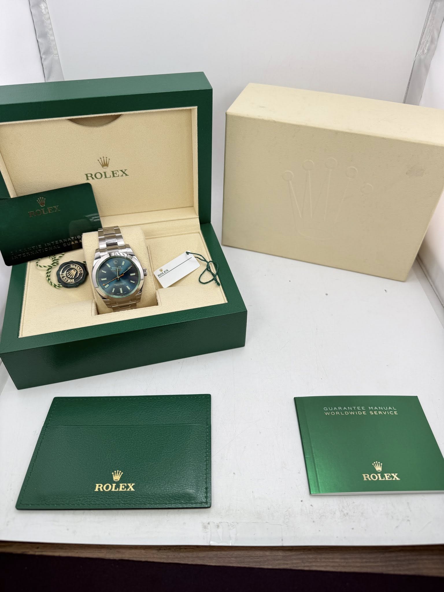 An amazing New Old Stock 40mm Milgauss. It features a 40mm smooth bezel with steel oyster bracelet and a stunning blue dial with orange markers and green crystal. It looks amazing on the wrist and a ton of watch for the money. Brand new unworn unsized new old stock