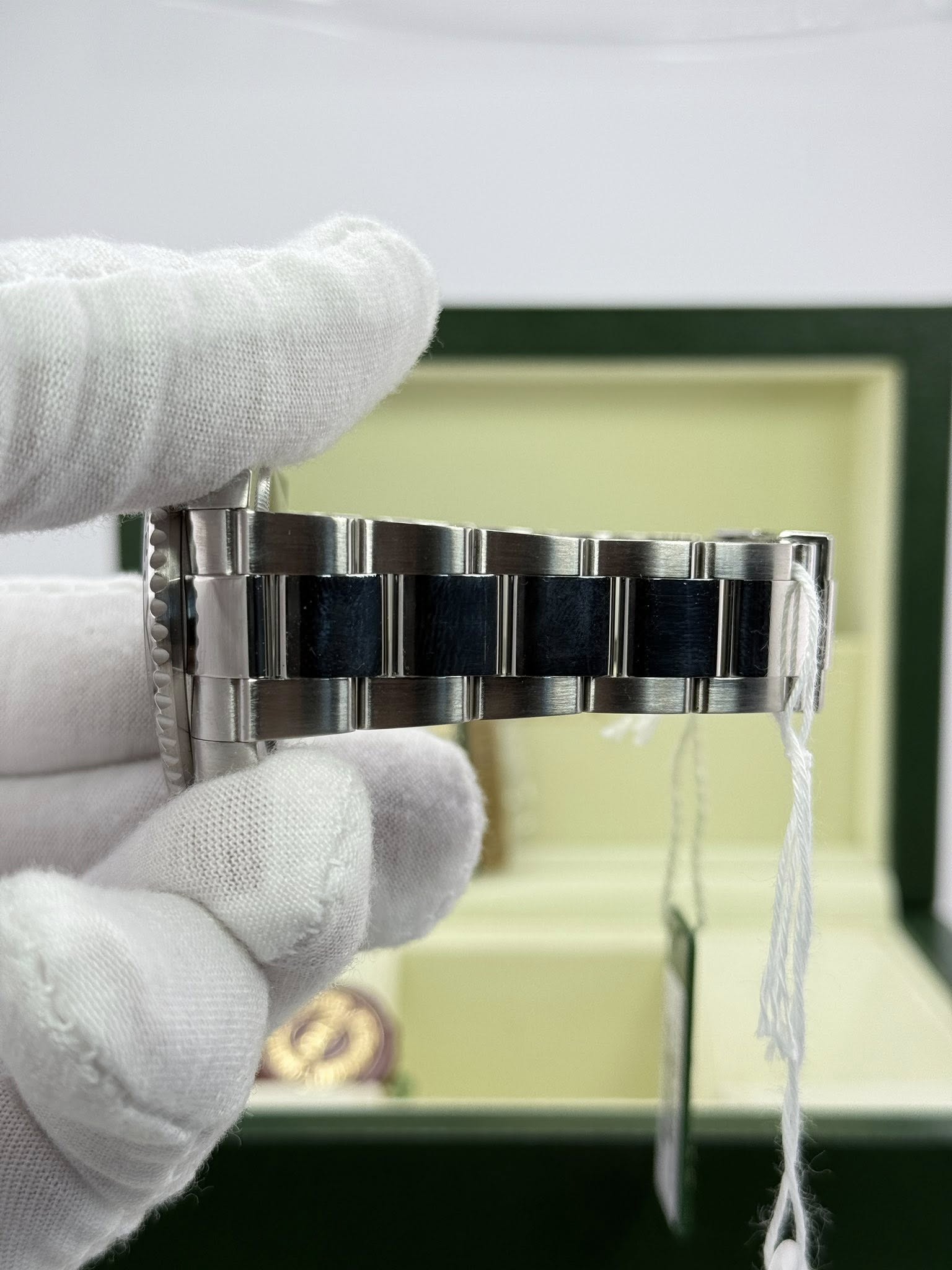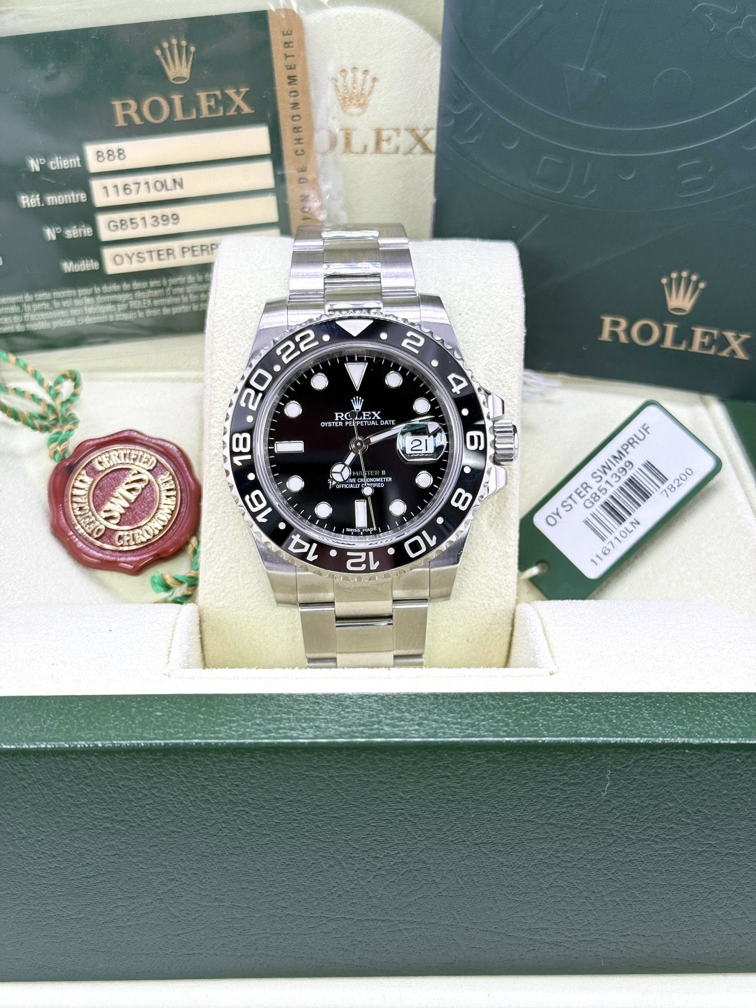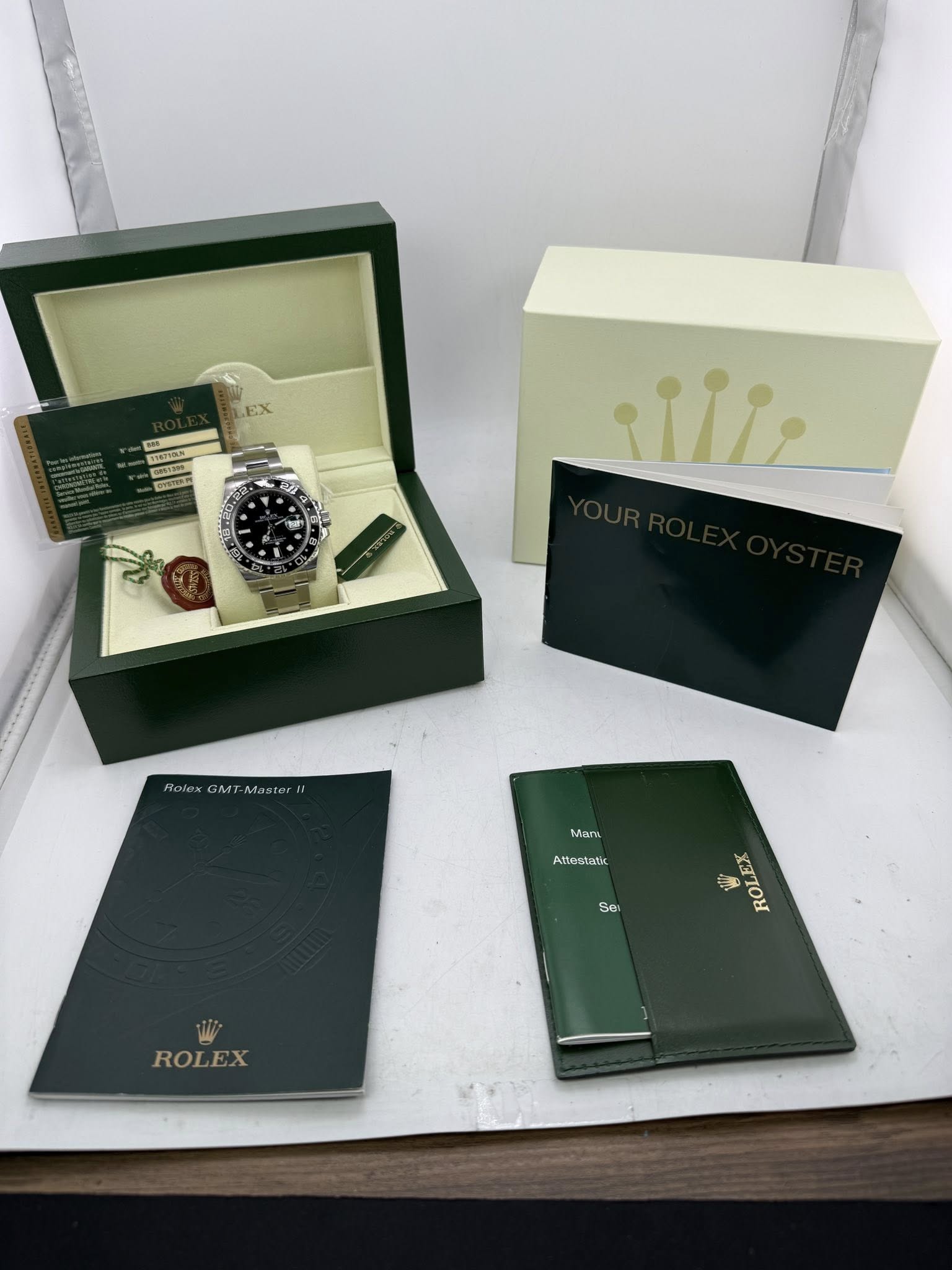 This is the young Bruce Wayne before he started going grey. A 40mm GMT Master II. It features a black ceramic rotating bezel, oyster bracelet with flip lock Clasp and beautiful black dial. the green arrow with green gmt hand one of the best builds. Recently cleaned and pressure tested its running great.