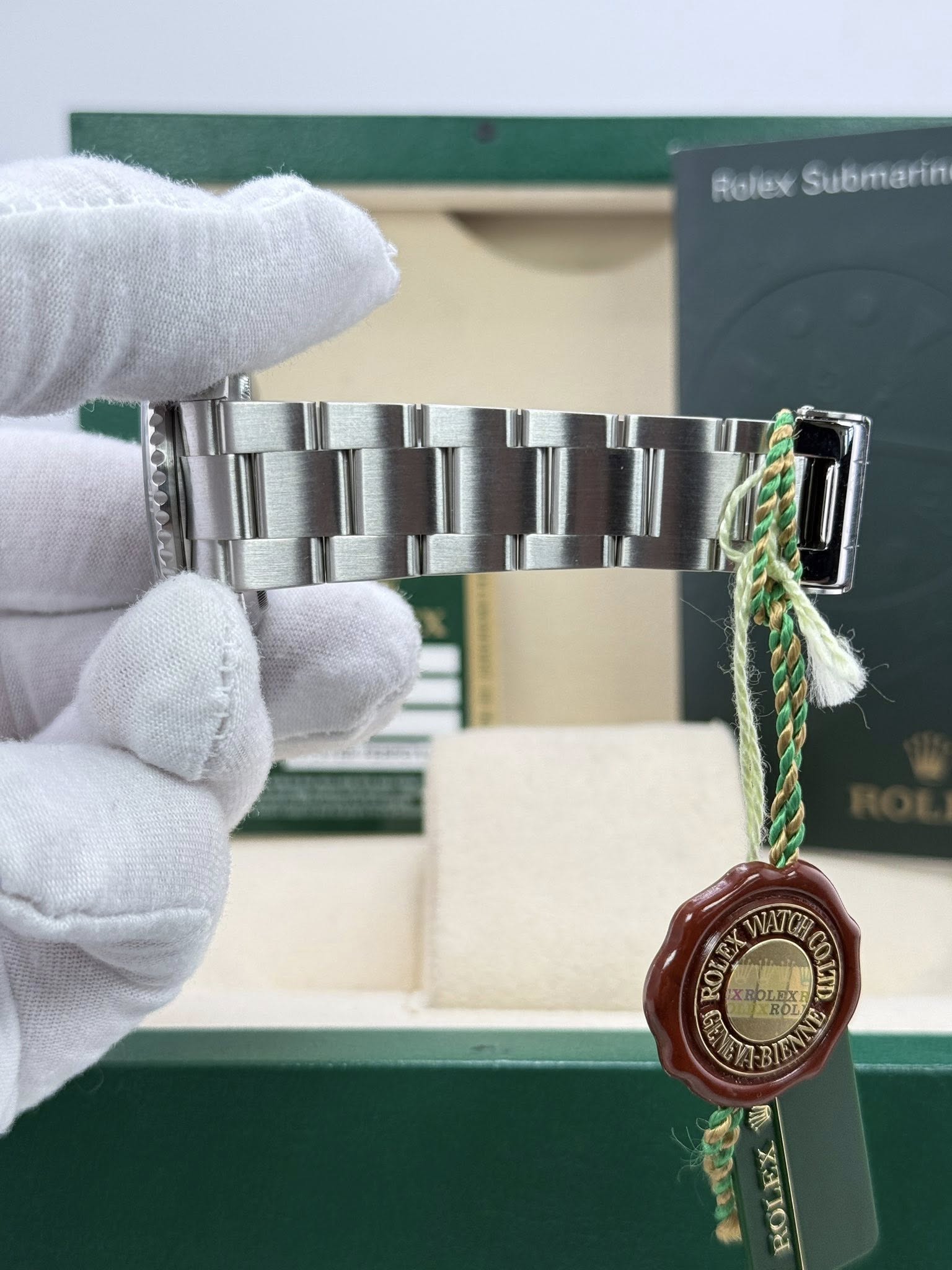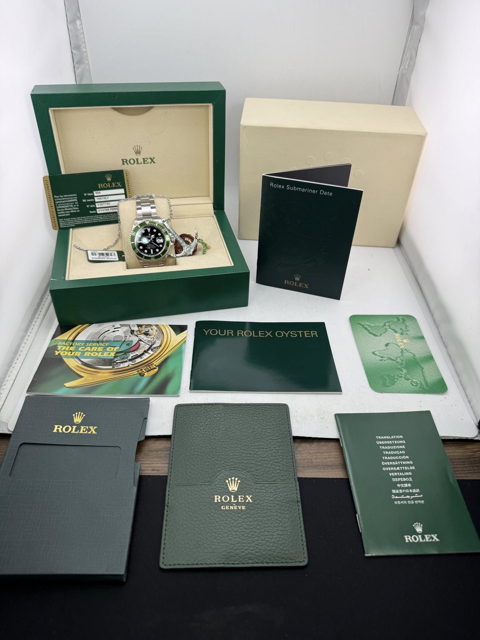 Mens submariner Kermit. One of the rare collector models it Features a 40mm steel case with aluminum green bezel and black dial. highly desirable late production model with engraved Rehaut and warranty card. Rare to find this clean and complete.