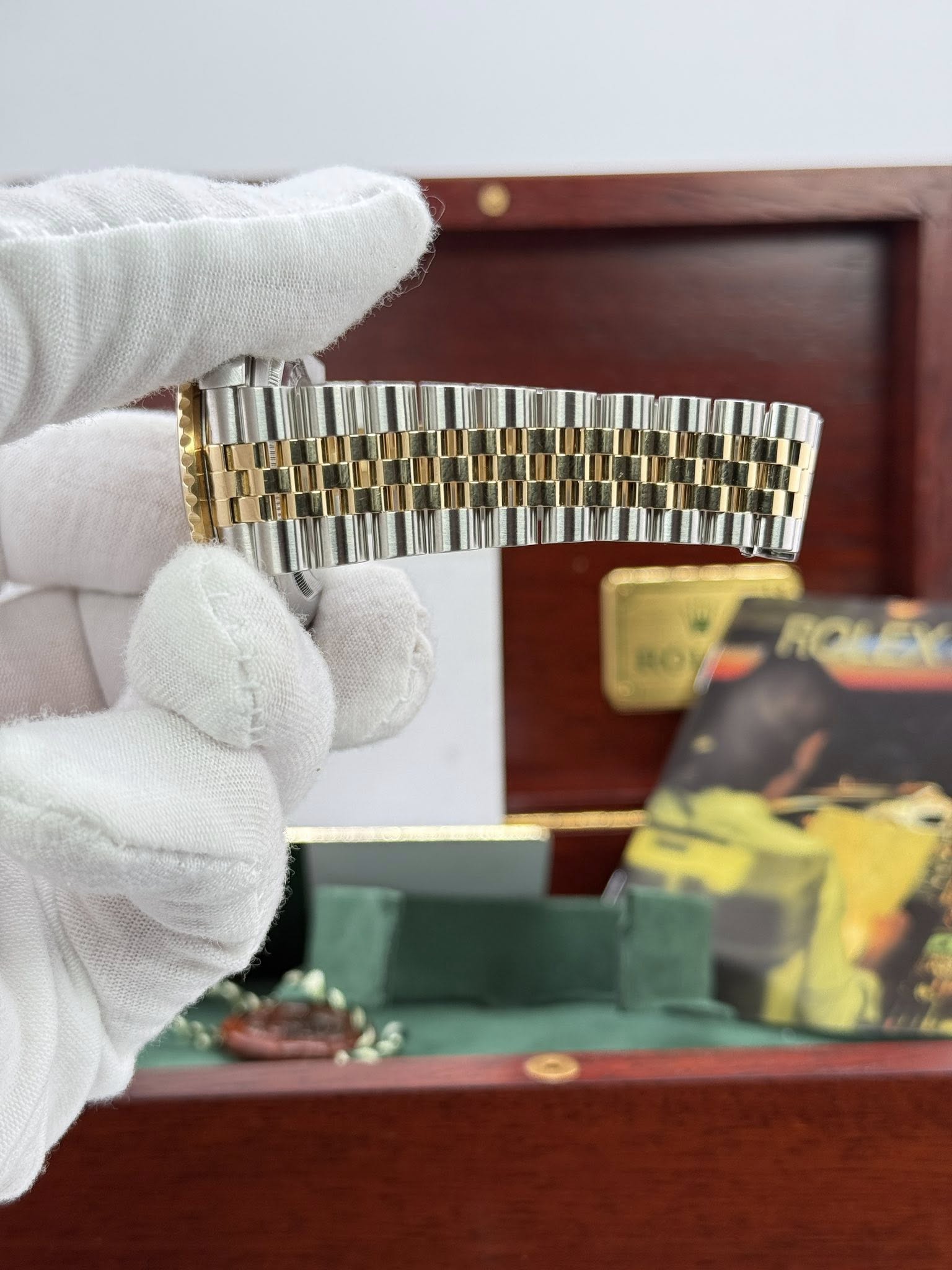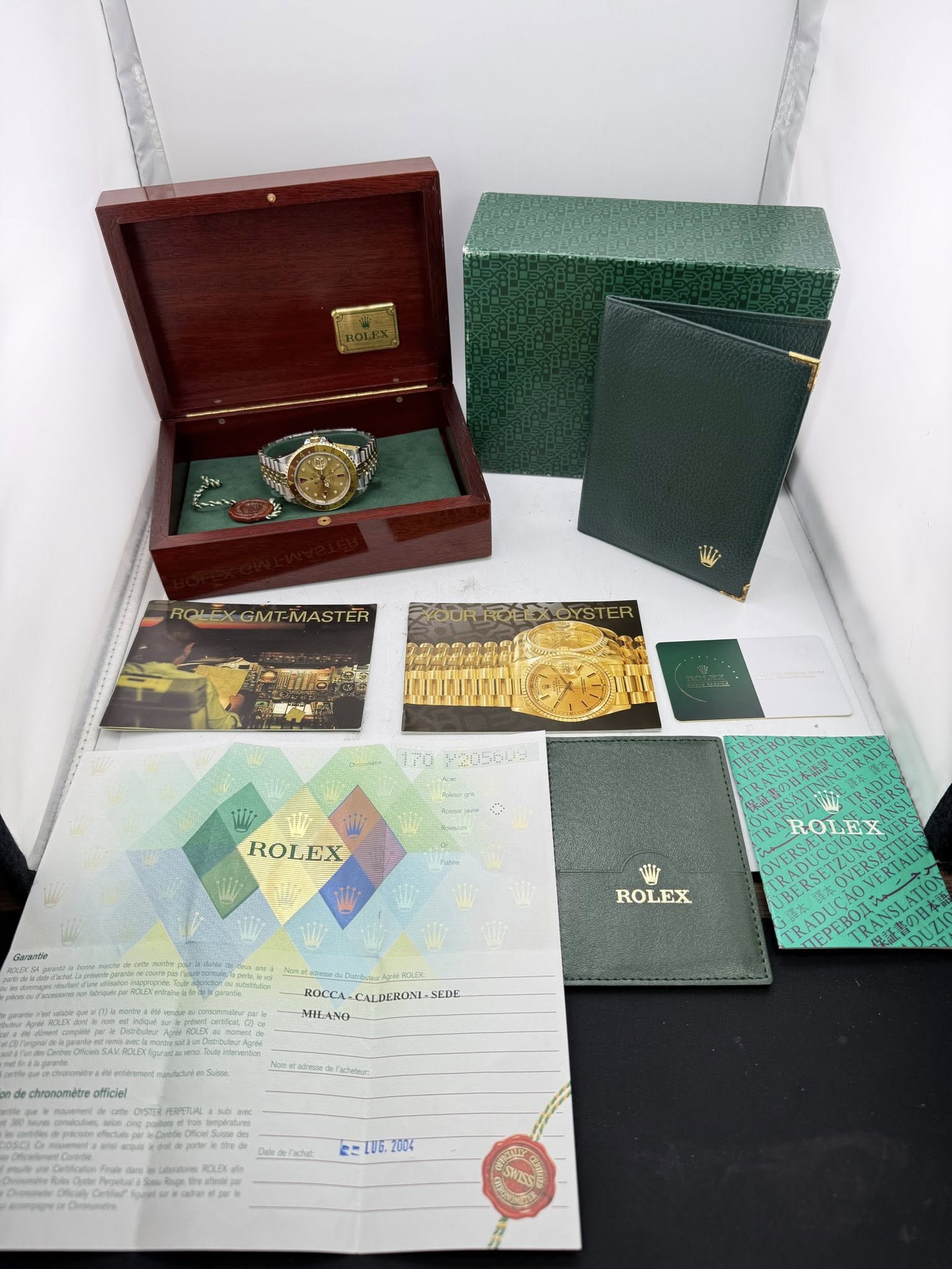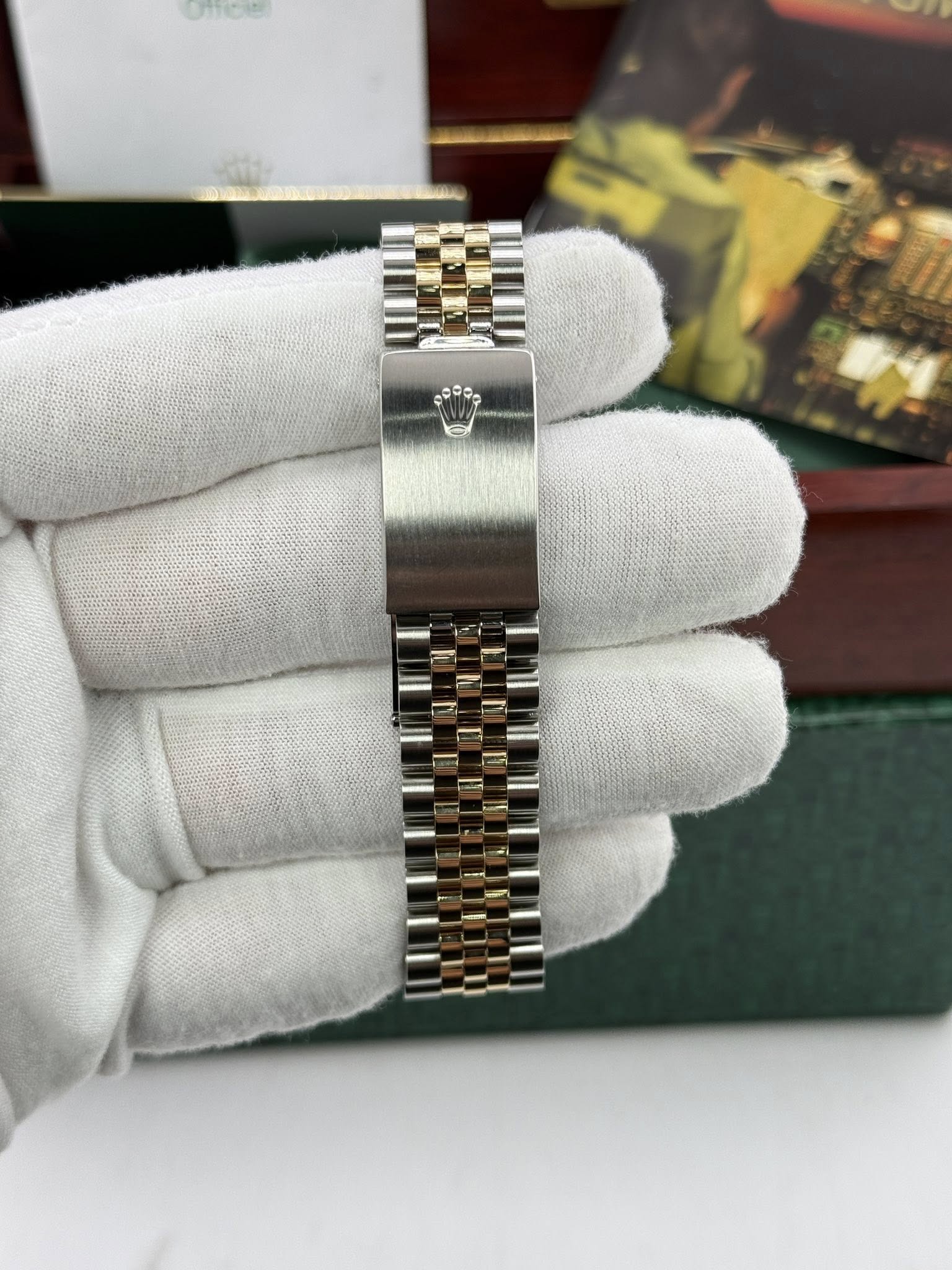 Mens 40mm two tone 18k gold GMT Master II Rootbeer serti. It features an 18k gold rotating bezel with rootbeer aluminum insert and 18k gold and steel jubilee bracelet. A very rare and beautiful factory Rolex build. Fully overhauled by RSC (RolexServiceCenter) in 2024 it’s in amazing condition.