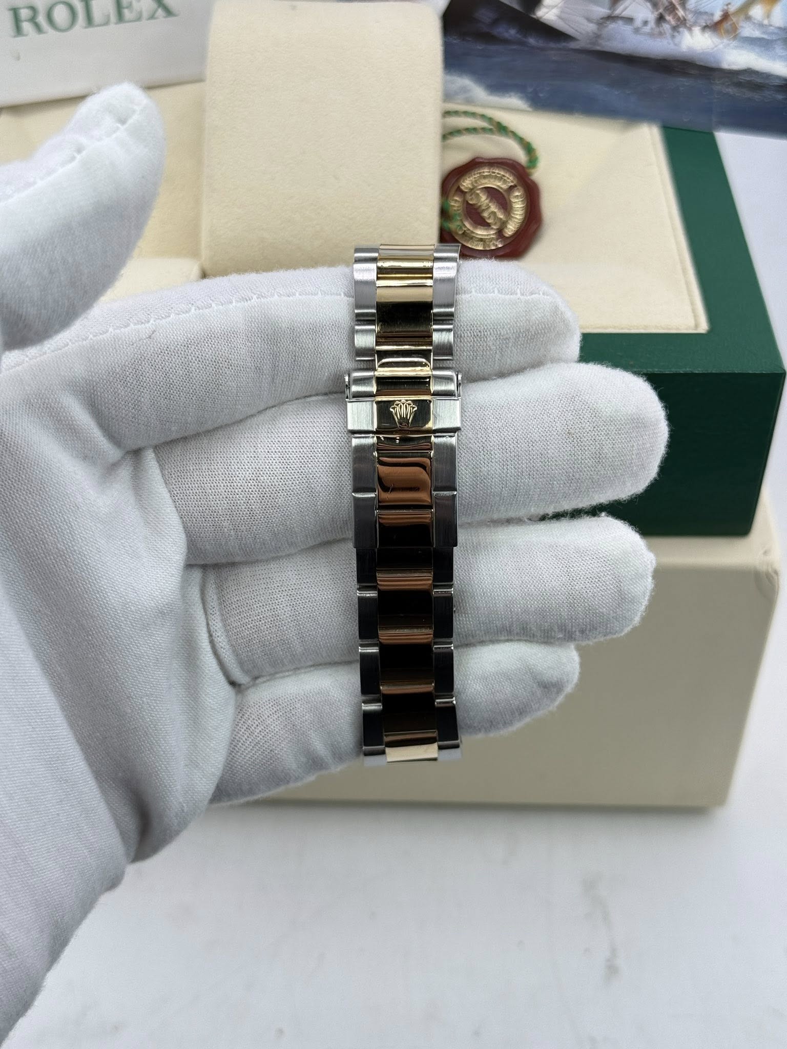 A Stunning 40mm Two Tone 18k gold Yatchmaster. It features solid 18k gold rotating bezel, two tone 18k gold oyster bracelet and a beautiful blue dial with white markers. The combo really makes this piece stand out. Recently cleaned polished and pressure tested its running great.