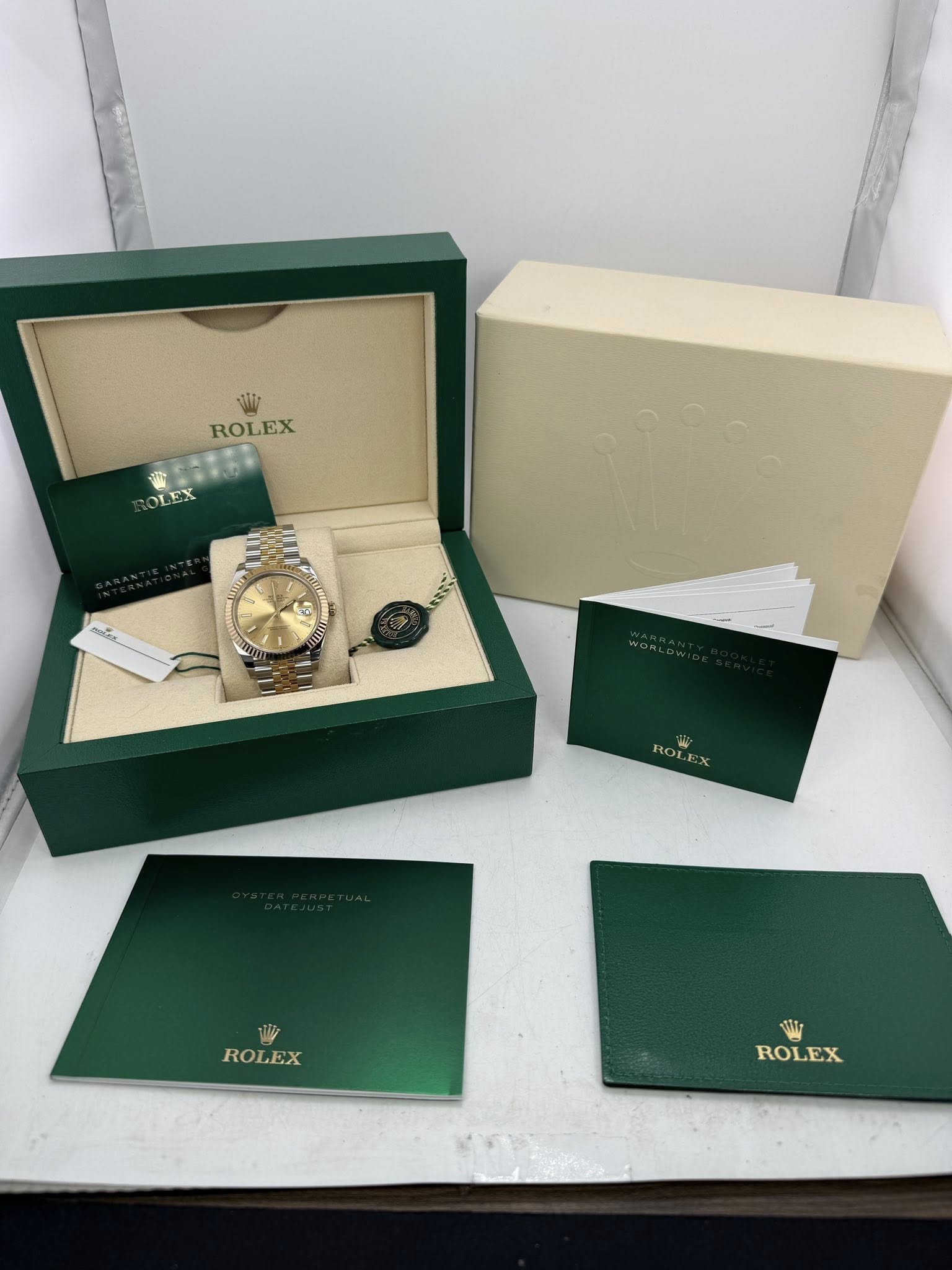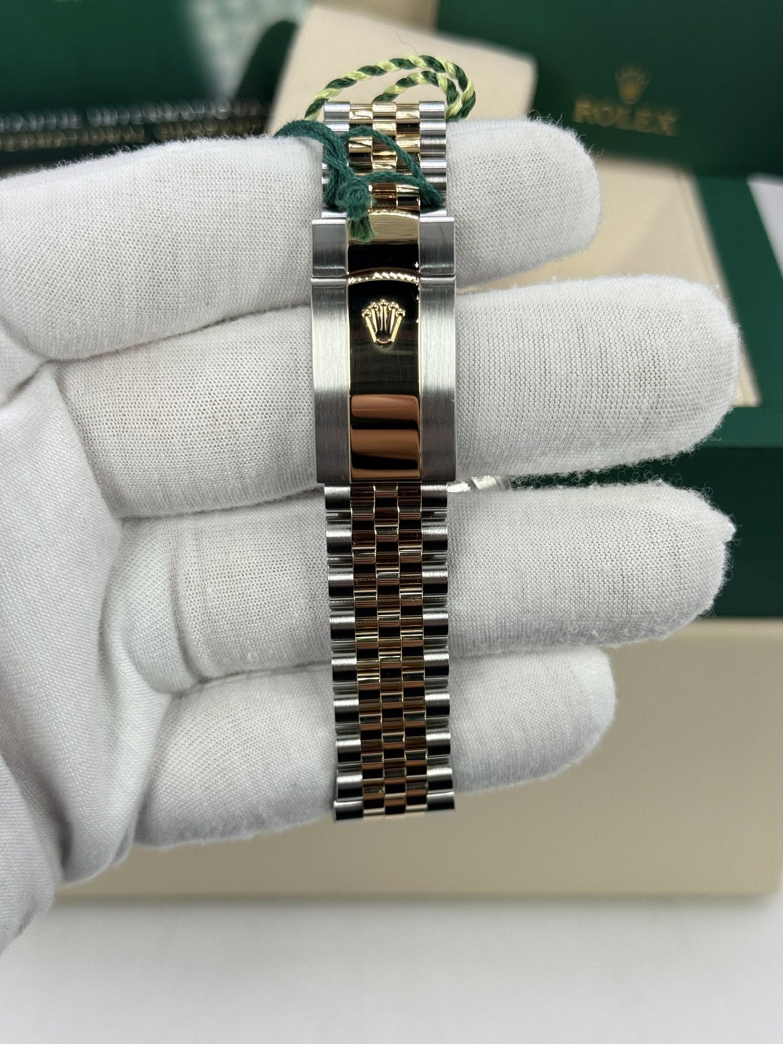 A beautiful 41mm Two Tone Date-just. It features a solid 18k gold fluted bezel, Two Tone 18k gold jubilee bracelet and a stunning Champagne baton dial. Great condition still under factory warranty.
