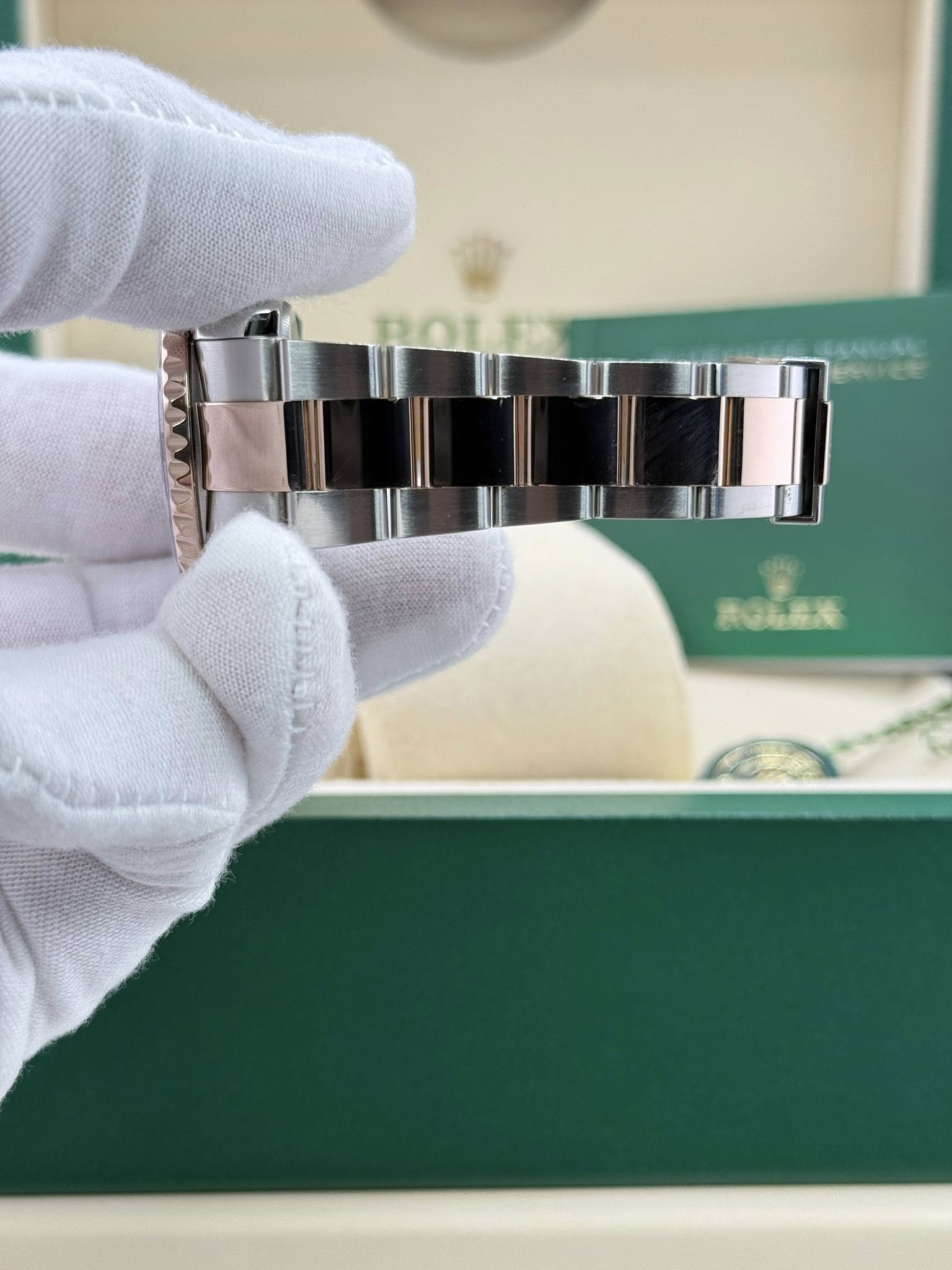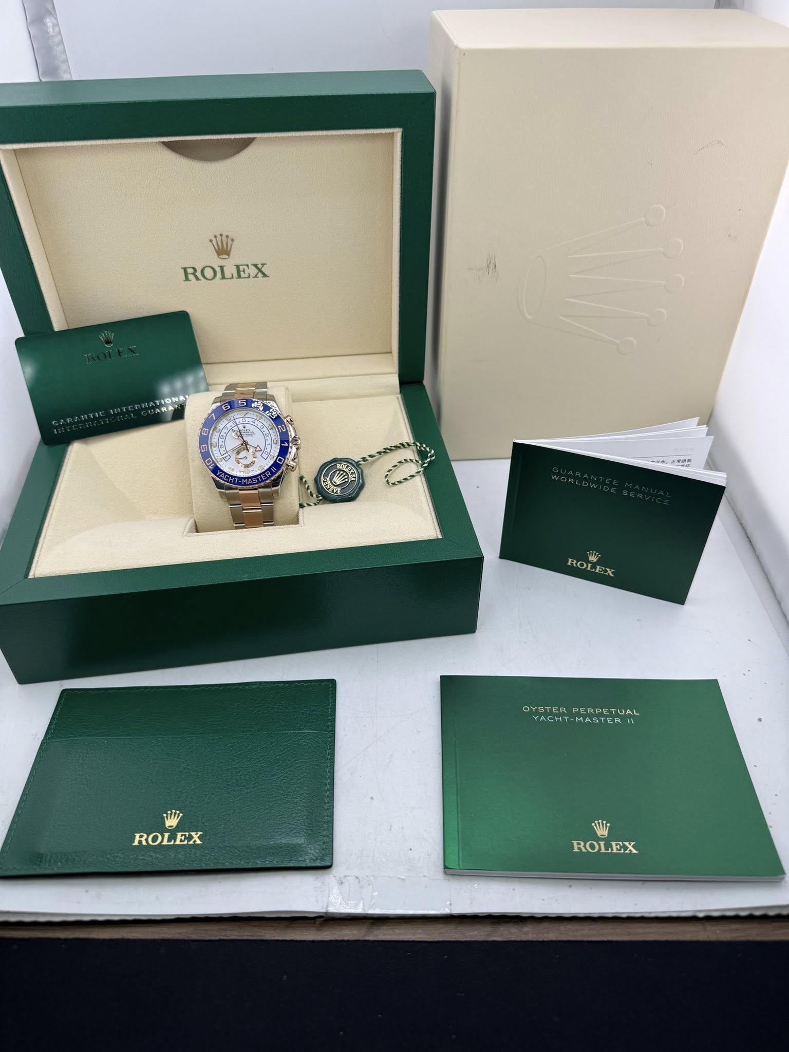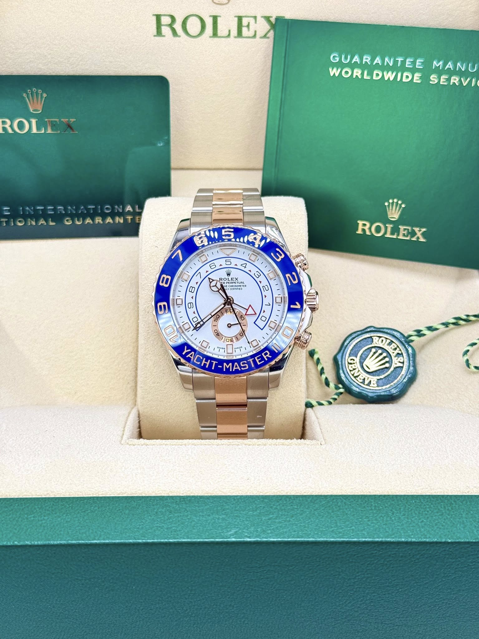 The Oyster Perpetual Yacht-Master II in Oystersteel and Everose gold with an Oyster bracelet and a bidirectional rotatable bezel with a blue Cerachrom insert. A stunning watch at 44mm it looks amazing on the wrist. This is the newer reference with Mercedes Hands.