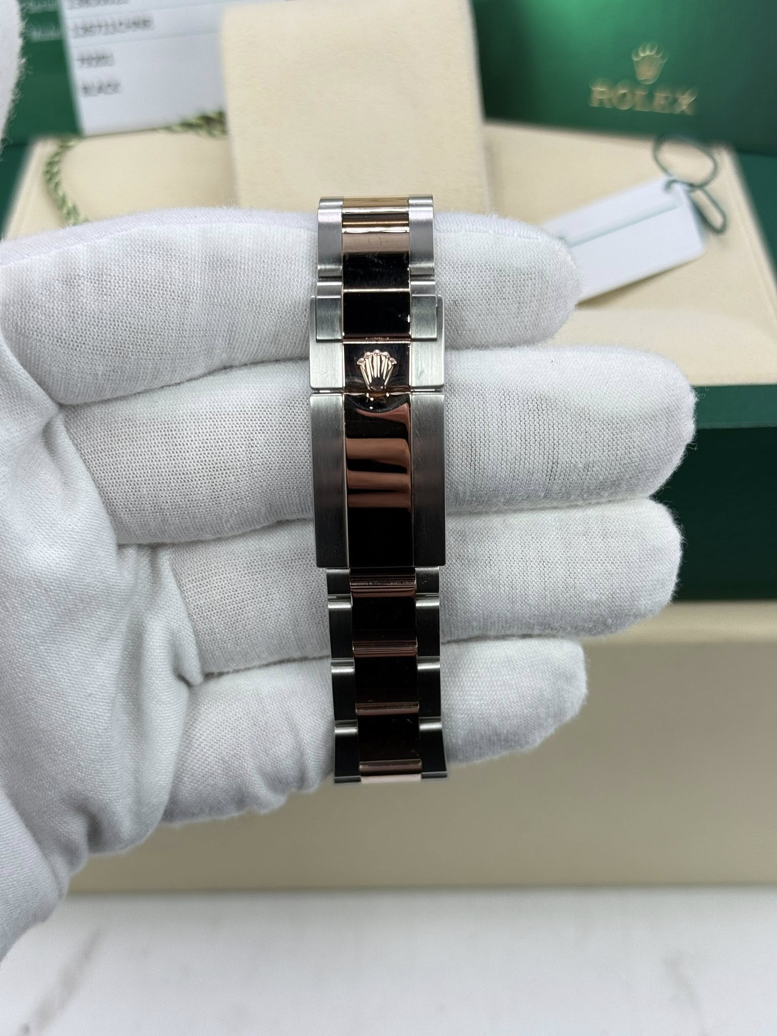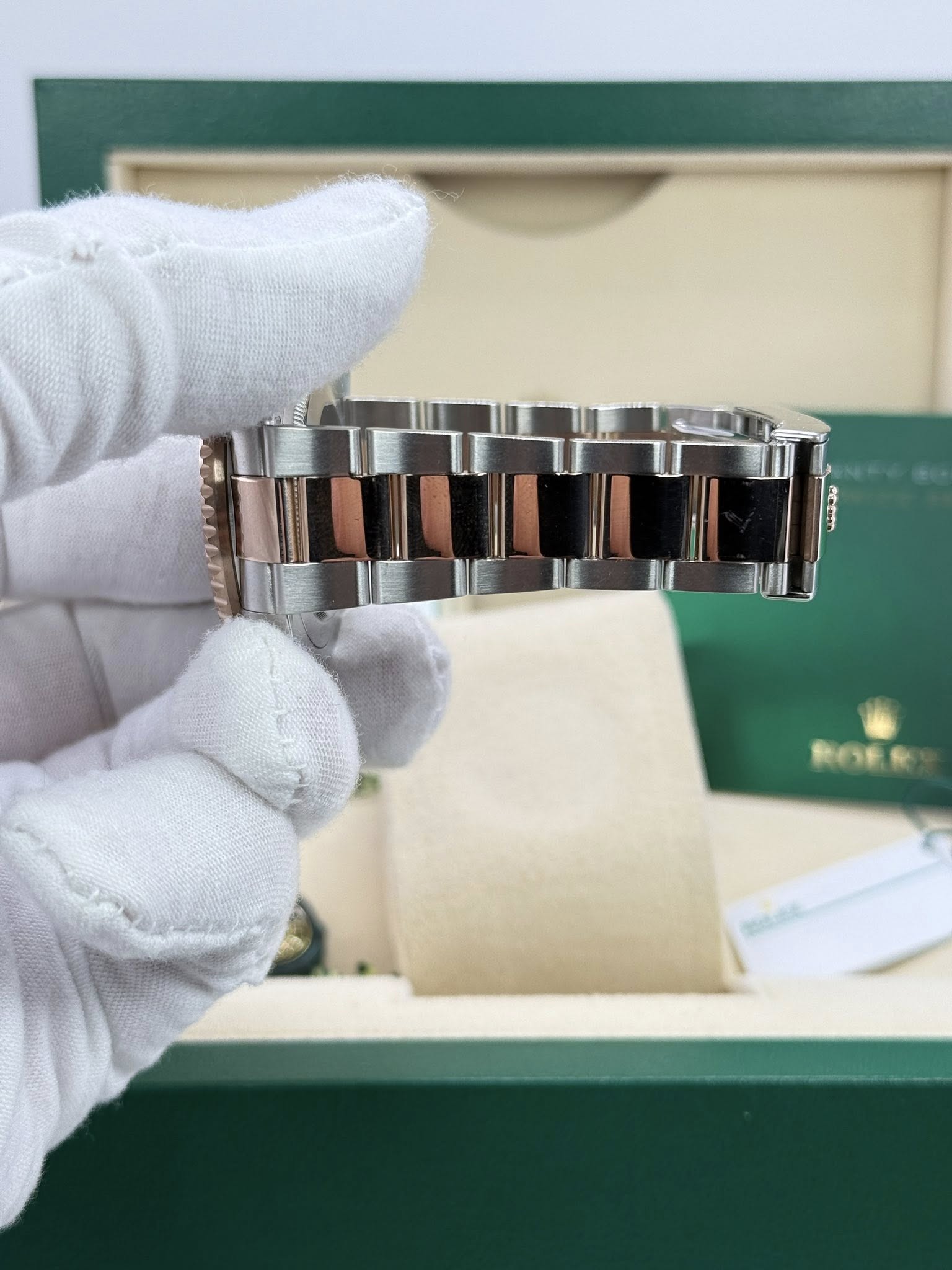 A beautiful 40mm Rolex GMT 18k Everose Gold Rootbeer. It features a solid 18k gold bezel, 18k gold two tone oyster bracelet and black dial with white markers. A amazing timepiece in great condition.